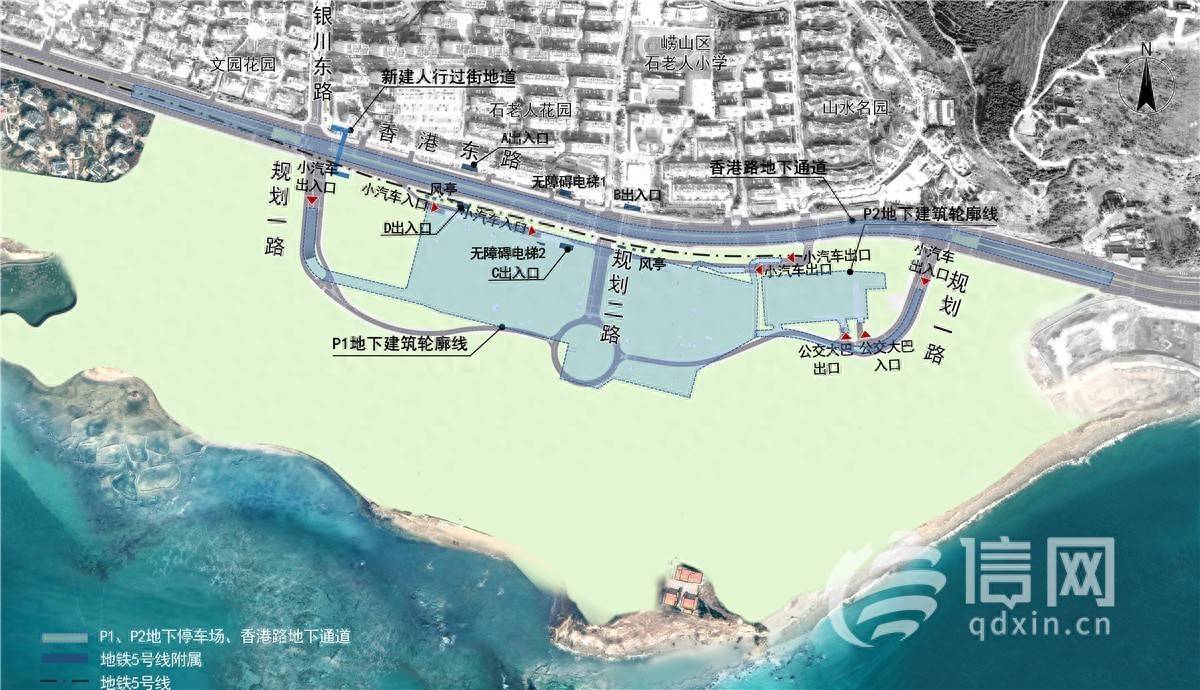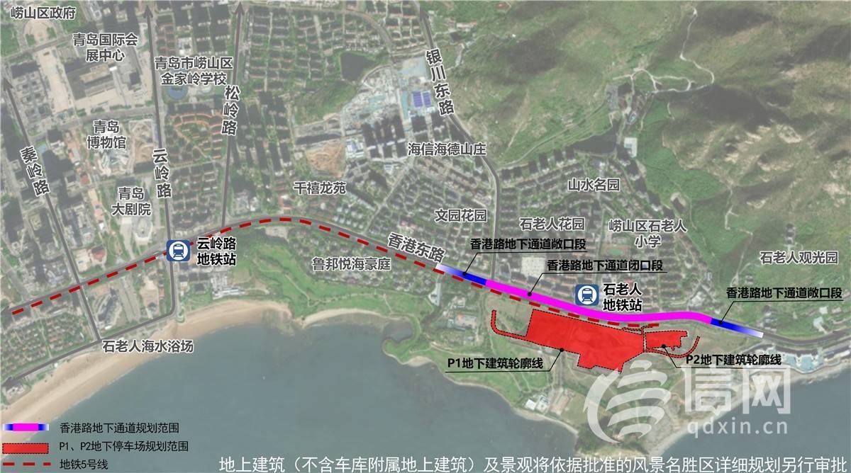 近期拟在该区域建设地铁5号线延伸段工程石老人站(车站共设置4个出入口,2部无障碍电梯,2个安全出口,2组风亭,与周边建构筑物距离均满足相关规范要求)及P1、P2两处地下停车场、香港路地下道路工程(总长约1.5公里),其中P1地下停车库3385辆,P2地下停车库128辆,共计停车位3513辆。除地铁出入口、风亭、安全口及停车场地面疏散楼电梯、风井、坡道出入口外,香港东路以南的地上部分规划,以后期批准的景区详规为准。(信网记者)